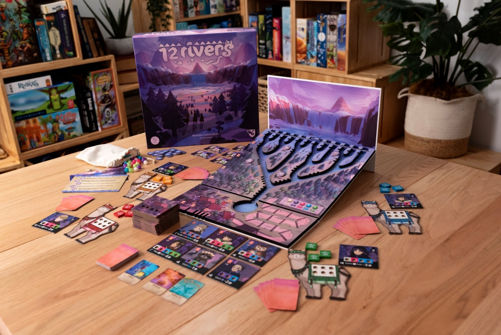 In 12 Rivers, players lead one of four tribes and take turns sending warriors to climb the mountain. The warriors camp near the river to collect Nature's bounties and bring these resources to villagers in need. Warriors can collect more valuable bounties if they move toward the origin of the river, but more camp tools have to be paid as well. After five rounds, the bounties to the villagers will be scored for players based on the rarity.
