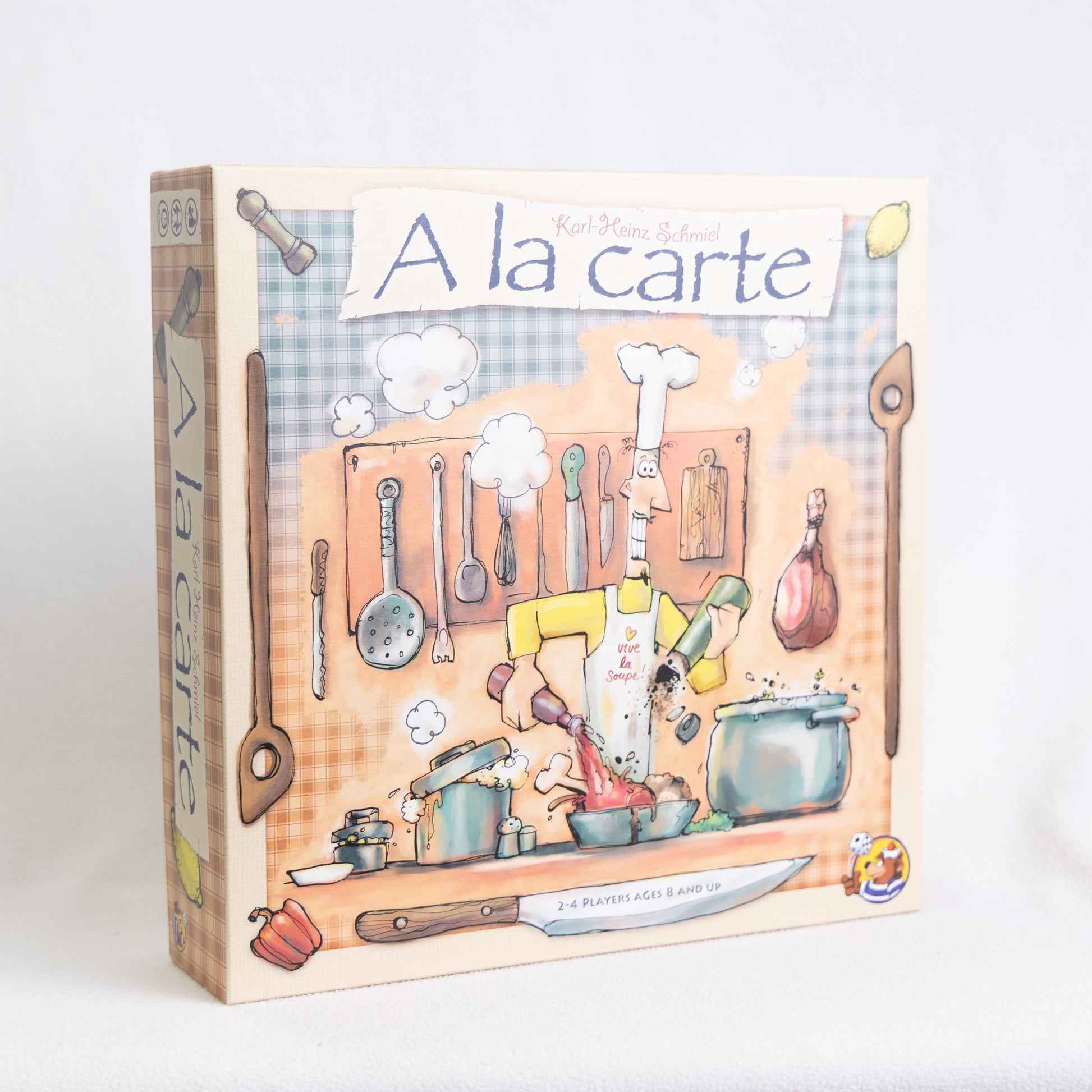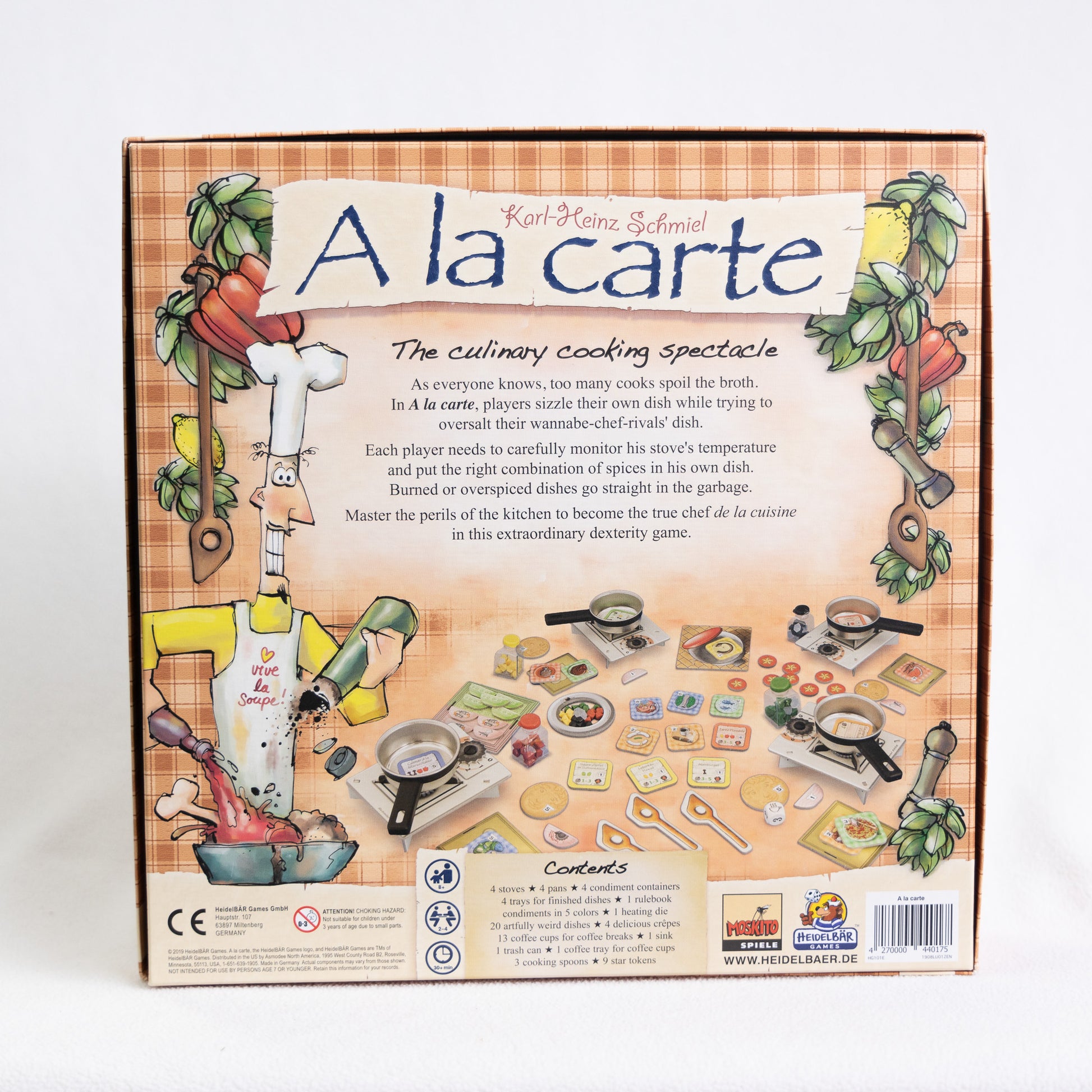 In one of his sillier games, Karl-Heinz Schmiel casts the players as semi-psychotic cooks attempting to hone their culinary skills. Each player receives a miniature pan and a hotplate. Then each turn you can either attempt to turn up the heat, season your dish, or attempt to steal another cook's recipe in the making. Heating your hotplate is a random affair with a die, and could raise the heat on everyone's plate. Spicing the dish is heart of the game and done by up-ending small bottles filled with little colored wood pellets. When the pellets tumble out of the bottle (sometimes, if they do), the number of pellets can't exceed two, because over-spicing the dish ruins it and you have to throw it in the trash!