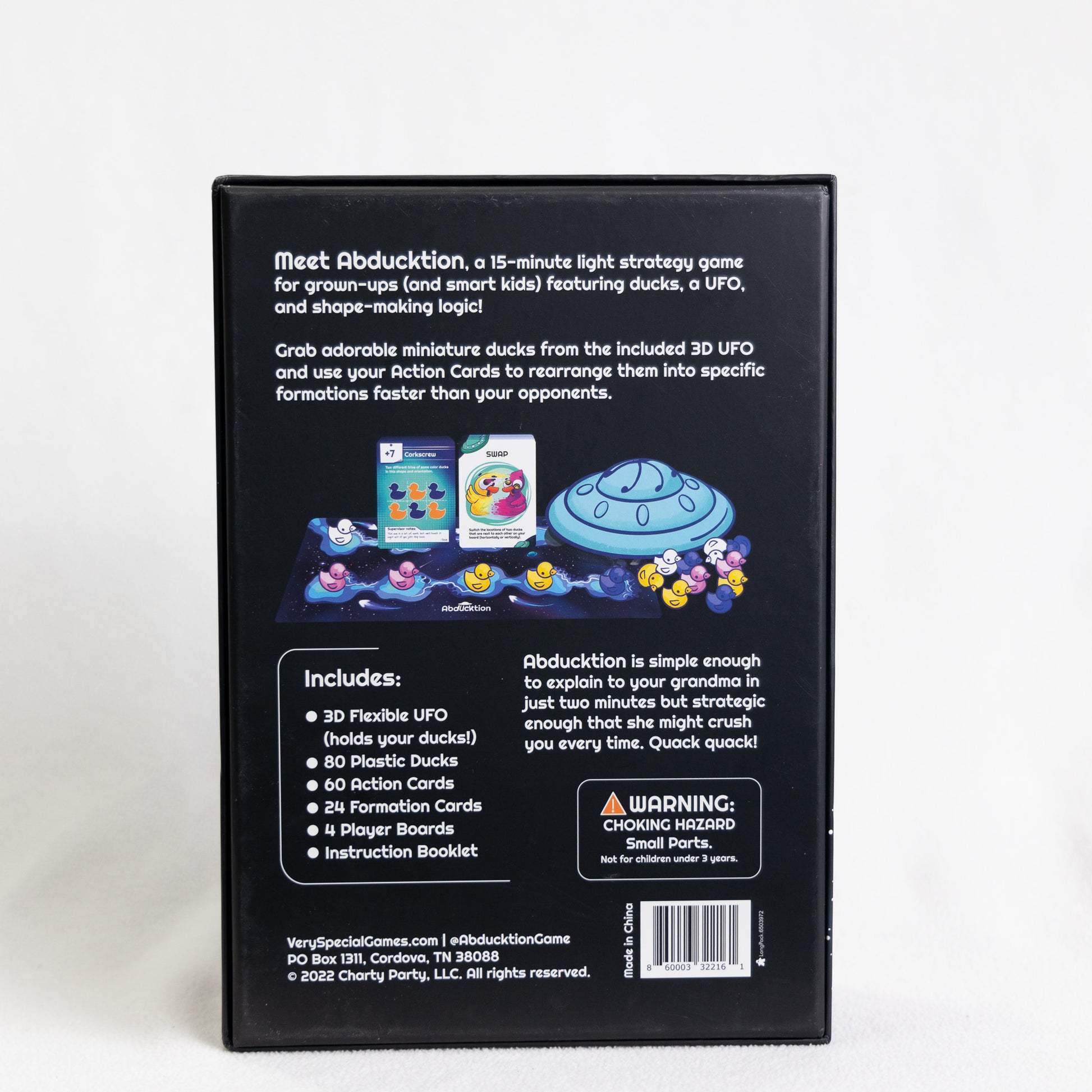 A 15-minute light strategy game for adults of duck matching, a UFO, and logic! Players are all interns on an alien UFO, working for an intergalactic corporation that has one main function: abducting ducks. (For research purposes, duh).