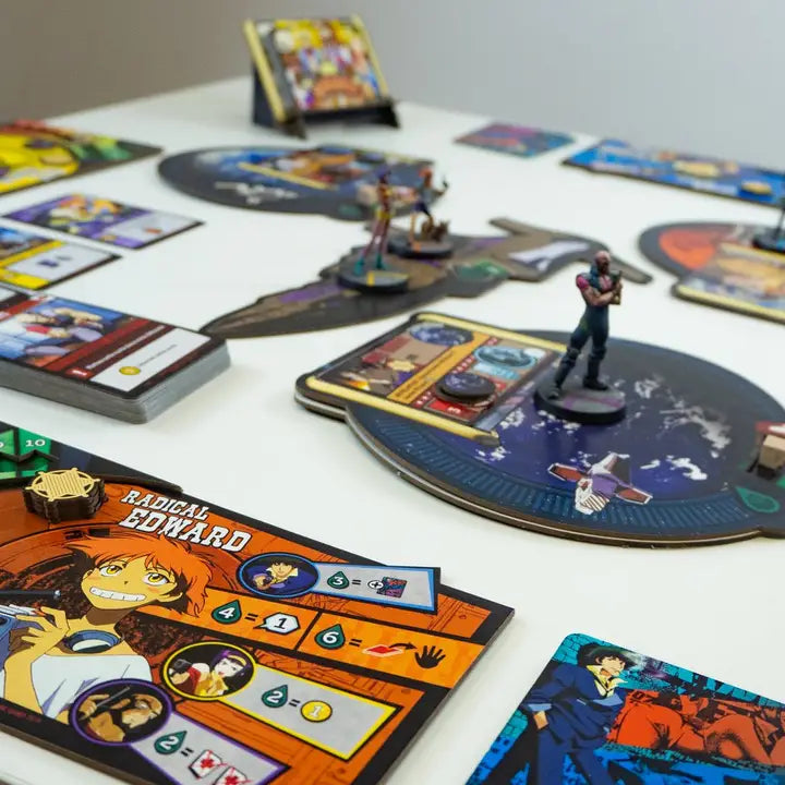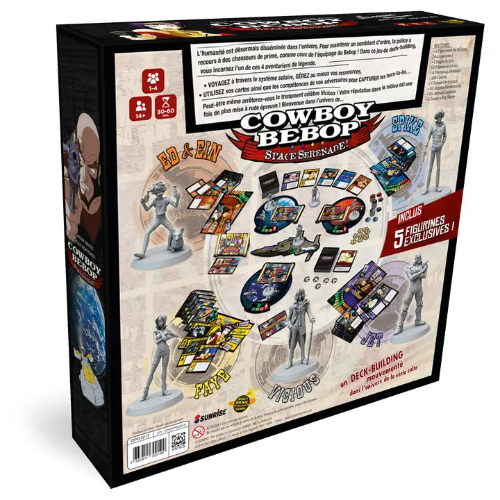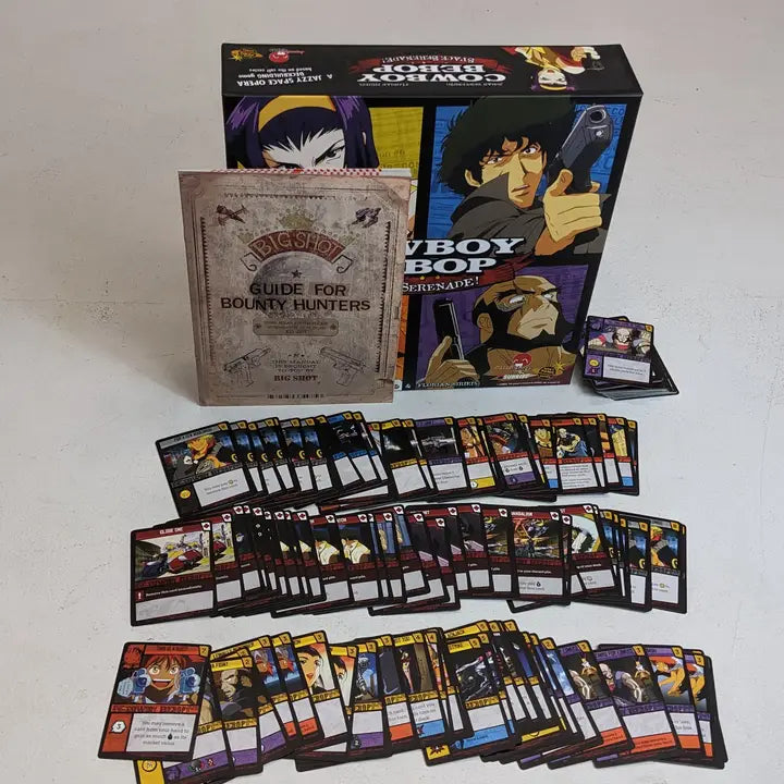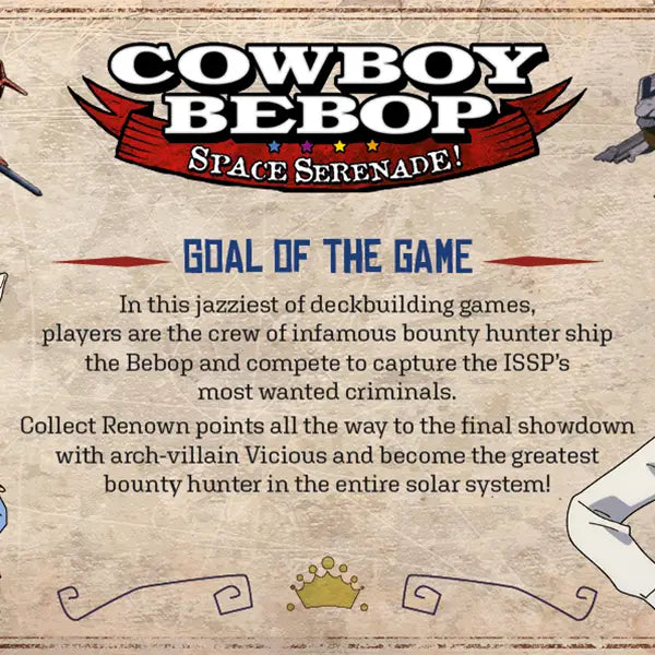 Humanity has spread across the solar system and governments must rely on bounty hunters to enforce a semblance of law in the vastness of space. Play as one of the infamous crew of the spaceship Bebop and hunt criminals in this action-packed and jazzy deck-building game. Travel across the solar system and manage limited resources, use your cards and get help from other players to capture wanted outlaws and claim the rewards! Come head-to-head with the dangerous Big Shot Vicious and lay your reputation on the line for that final, juicy contract. Do you have what it takes to make it? Welcome to Cowboy Bebop: Space Serenade!