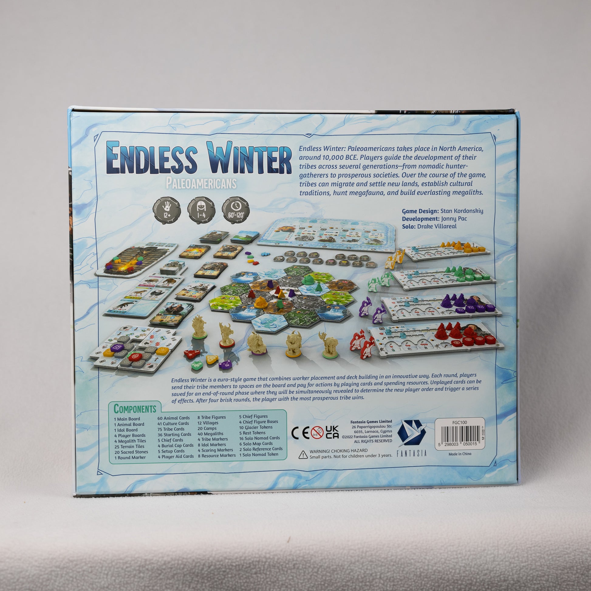 Designed by Stan Kordonskiy (Dice Hospital, Rurik, Lock Up), developed by Jonny Pac (Coloma, Sierra West, Lions of Lydia), solo mode by Drake Villareal (Solani, Spook Manor), and illustrated by The Mico (Raiders of the North Sea, Paladins of the West Kingdom, Valeria), Endless Winter: Paleoamericans takes place in North America, around 10,000 BCE. Players guide the development of their tribes across several generations—from nomadic hunter-gatherers to prosperous tribal societies. Over the course of the game, tribes migrate and settle new lands, establish cultural traditions, hunt paleolithic megafauna, and build everlasting megalithic structures.