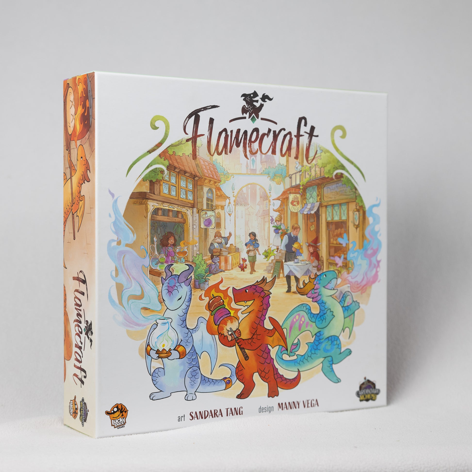 Artisan dragons, the smaller and magically talented versions of their larger (and destructive) cousins, are sought by shopkeepers so that they may delight customers with their flamecraft. You are a Flamekeeper, skilled in the art of conversing with dragons, placing them in their ideal home and using enchantments to entice them to produce wondrous things. Your reputation will grow as you aid the dragons and shopkeepers, and the Flamekeeper with the most reputation will be known as the Master of Flamecraft.