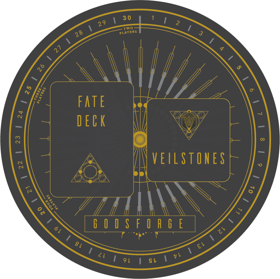 Godsforge features simultaneous play, with each player attacking the player to their left and defending against the player on their right. On a turn, everyone simultaneously rolls four dice, then each player lays one of their four cards face down in front of them. In any order you want, players reveal those cards, paying the cost of them via specific numbers on rolled dice, the sum of rolled dice, veilstones, or a combination of the above.