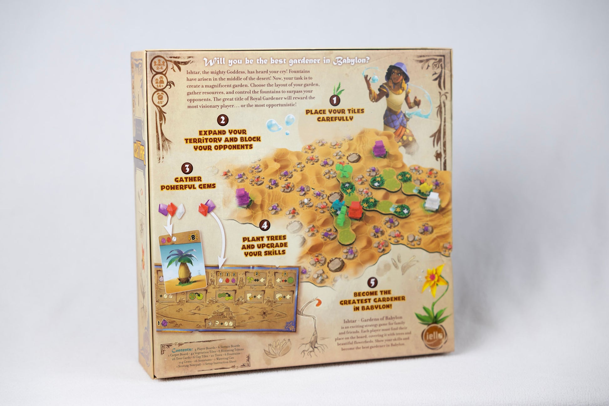 From the award-winning designer Bruno Cathala, Ishtar is a game in which you play the role of a gardener aiming to transform the dry desert into the Lost Hanging Gardens of Babylon. To accomplish your mission, you will have to plant flowers, which, if you place them well, can help you gather precious gems and activate actions. Whether to buy Trees (which will block the link between two Flower spots, as well as earning you points) or to purchase upgrades (such as getting two more points per Tree card at the end of the game), collecting gems will be a crucial part of the game. Get them before your opponents, recruit apprentices, send them to earn points in the copses of flowers you have created, block others and think carefully of the upgrades to purchase if you want to become the best gardener at the end of the game!