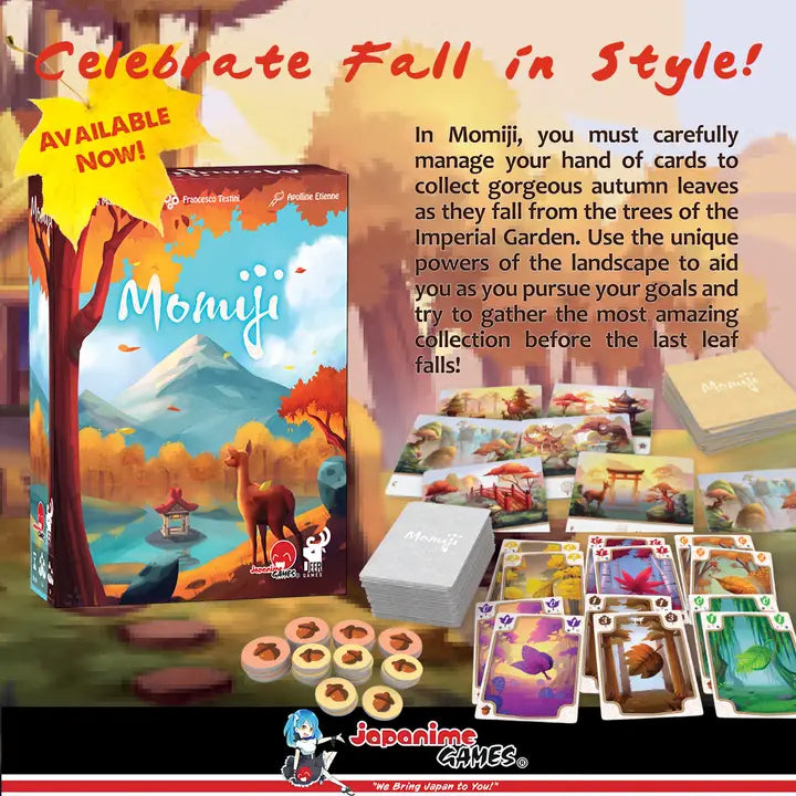 “In the Imperial Garden, during the last months of the year, the trees turn vivid hues of red, orange and yellow. The cold wind, the dancing of the leaves falling from the maple trees and the animals preparing for hibernation create this romantic painting that you never forget...” In Momiji, you must carefully manage your hand of cards to collect gorgeous autumn leaves as they fall from the trees of the Imperial Garden. Use the unique powers of the landscape to aid you as you pursue your goals and try to gather the most amazing collection before the last leaf falls!