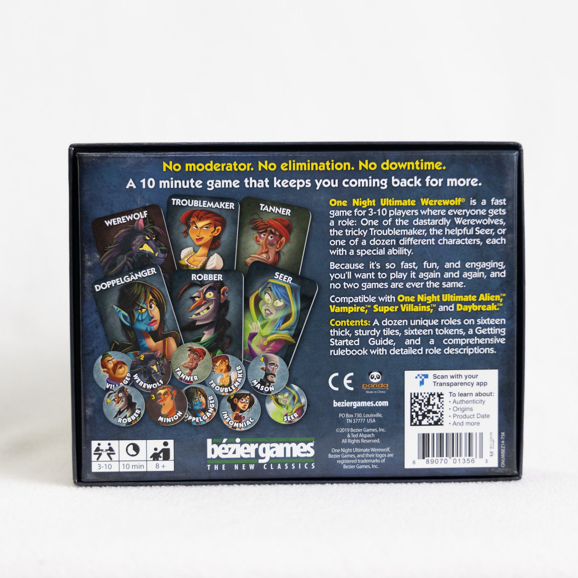 One Night Ultimate Werewolf is a fast game for 3-10 players in which everyone gets a role: One of the dastardly Werewolves, the tricky Troublemaker, the helpful Seer, or one of a dozen different characters, each with a special ability. In the course of a single morning, your village will decide who is a werewolf...because all it takes is lynching one werewolf to win!