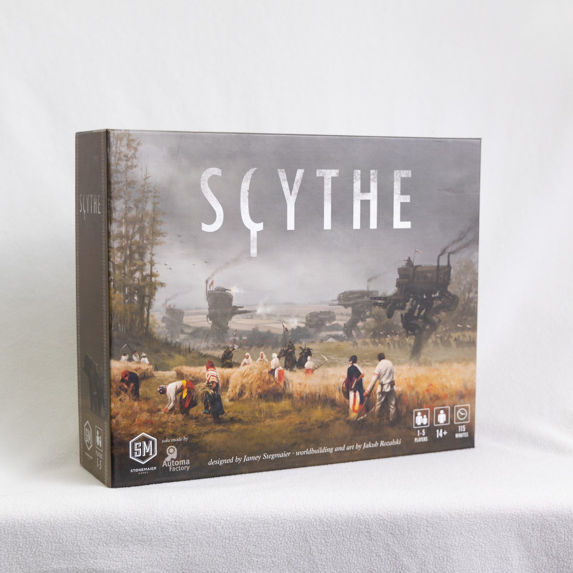 Scythe is an engine-building game set in a 1920s era, alternate-history. It is a time of farming and war, broken hearts and rusted gears, innovation and valor. In Scythe, each player controls one of five factions of Eastern Europe, all of which are attempting to earn their fortunes and claim their stakes in the land around the mysterious Factory. Players conquer territory, enlist new recruits, reap resources, gain villagers, build structures, and activate monstrous mechs.