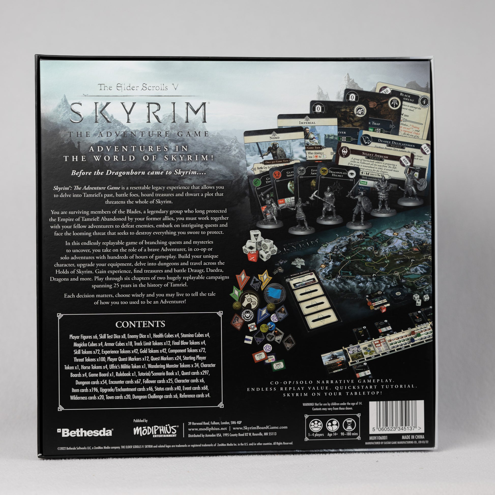 The Elder Scrolls V: Skyrim – The Adventure Game is a 1-4 player co-operative game of adventure and exploration across Skyrim. Players take the roles of heroes involved in epic quests, working together to defeat their enemies and exploring the vast expanse of Skyrim. You will be able to choose character miniatures like the Khajiit, Nord, or High Elf; plan your strategy with weapons or spells; and fight your way through forgotten mines, Draugr-infested tombs, or ancient Dwemer cities to find ancient treasures and increase your power.